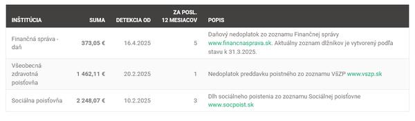 Sociálna poisťovňa 156,50 € 12.5.2025 2 Dlh sociálneho poistenia zo zoznamu Sociálnej poisťovne www.socpoist.sk https://finstat.sk/54815444 a stránka mi skôr sedí táto https://www.cfs.sk/revizie/ na revízie. Tržby 1M a zisk 78k tak snáď tých 156eur zaplatia :D Inak skúsenosti nemám, ale ak analýza tak presná.