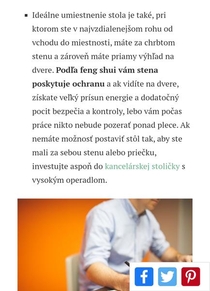 @viestta ja si toto vsetko logicky uvedomujem, necitim sa previnilo. Tam ide len o ten pocit, ze nevidim na dvere, kto vchadza a kto mi chodi za chrbtom. Ale neviem s tym nic robit. Skusala som sefs poziadat o zmenu miesta, bolo mi to zamietnute kvoli tomu ze s kolegami, ktori su pri mne uzko spolupracujem. A ano mas pravdu, ti ktori prisli do firmy ako prvi maju najlepsie miesta, su otoceni tvarou k dveram..