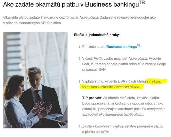 Pri importe (hromadnom príkaze) je predvolená možnosť ‚spracovať iba platby označené v súbore ako okamžité,“ vysvetľuje Tatra banka. Na webe má postup, ako takéto platby vykonať. Zvoliť sa dala aj možnosť, aby sa žiadna platba nevykonala ako okamžitá.