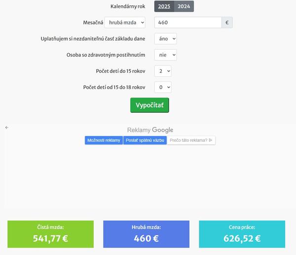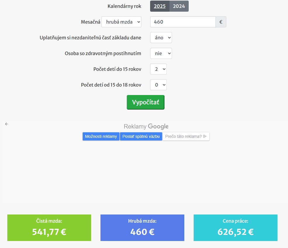 Prosím poradíte mi s výpočtom čistej mzdy? Na nete sú kalkulačky ale každá mi to vyrátala inak. Pracujem na polovičný uväzok, hrubá mzda je 460€ mám dve deti do 15 rokov. Uplatnujem si daňový bonus. Prosím kto vie poraďte mi. Ďakujem.