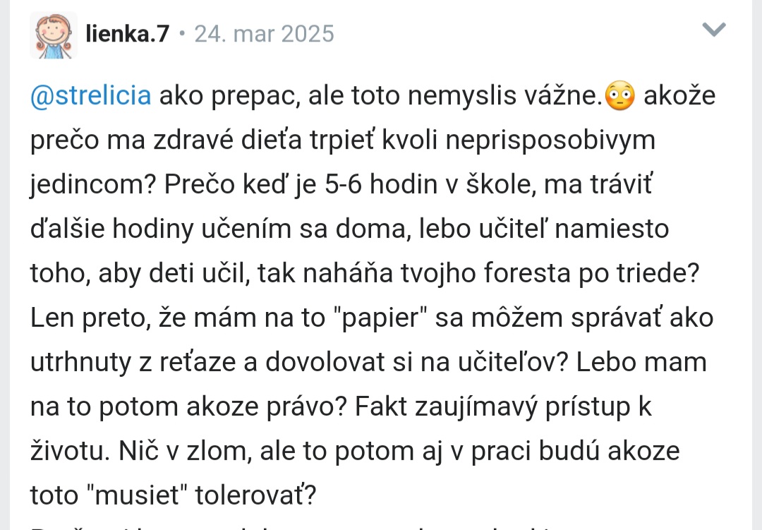 Na Slovensku si sa nestretla s tým, že agresivita je tolerovaná a ospravedlňovaná špecifickosťou dieťaťa? To píšeš teraz, v marci 2025? Po tom, čo takéto špecifické deti "nevadí, že sa nevie správať, ale je to génius" spáchali teroristický útok, či podrezali učiteľku??? V oboch pripadoch rodičia nesú vinu pre zľahčovanie situácie, a školy pre ignoráciu stavu.