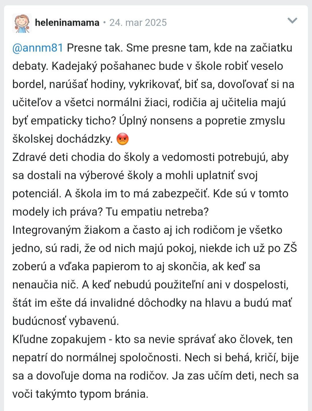 @annm81 súhlasím, že deti so špeciálnymi potrebami by mali mať špeciálnu podporu, pretože dnes je celé to bremeno hodené na učiteľa, ktorý naozaj nemá kapacitu riešiť každé problémové dieťa a zároveň sa venovať aj ostatným - to práve nie je tá inkluzia, o ktorej sa hovorí, pretože v inkluzii sa nedejú veci na úkor niekoho, čiže ani na úkor zdravých detí. . Akurát si nemyslím, že je správne deti segregovat, to sme tu mali za socializmu, že akékoľvek vybočenie z normy, počnúc telesným, končiac nadpriemerným IQ, bolo segregované a doba ukázala, že to nie je v poriadku. Takže podľa mňa sa musí nájsť zlatá stredná cesta. Sledujem na Instagrame jednu babu, má autistu, ktorý nerozpráva. Doma v ČR obrovský problém, kam dieťa umiestniť. Presťahovali sa do Talianska a dieťa chodí do klasickej školy, má asistentov a pobyt v škole má skrátený podľa potreby. A funguje to tam bez problémov. Chápem, že u nás sci-fi už len kvôli totálnemu podfinancovaniu školstva. Len chcem proste poukázať na to, že inkluzívne riešenia existujú.