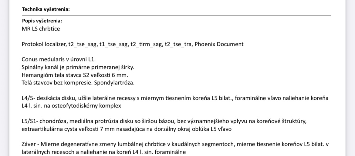 ahojko máš vyskocene a prasknute platnicky ktoré ti tlacia na miechu co sposobuje bolesti + zakrvacanie aj cystu. za mna smer dobry nerochirurg ktory zhodnoti ci operovať aby sa ulavilo Od bolesti alebo staci ina liečba drzim palceky