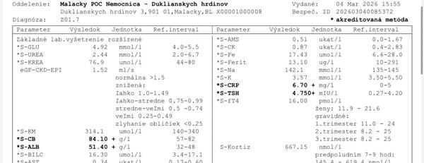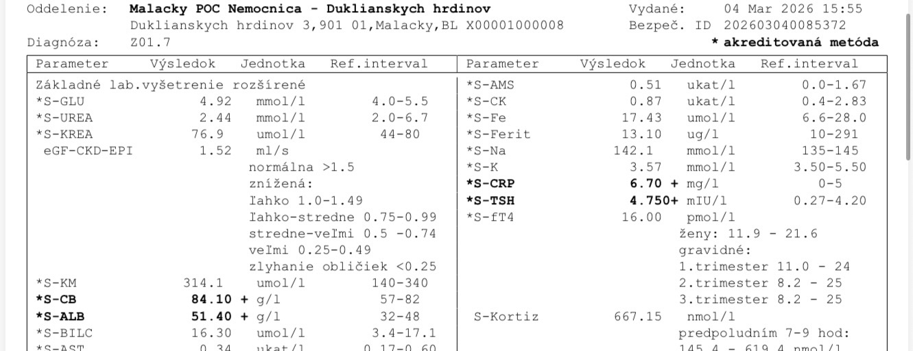 Mozem sem pridat vysledky z krvneho doberu a moču, čo som si davala robit v Medirex laboratoriu na vlastnu žiadosť, inak žiadne ine vysetrenia som nemala, ani žiadne lieky. Toto su jedine vyšetrenia čo zatial mam.