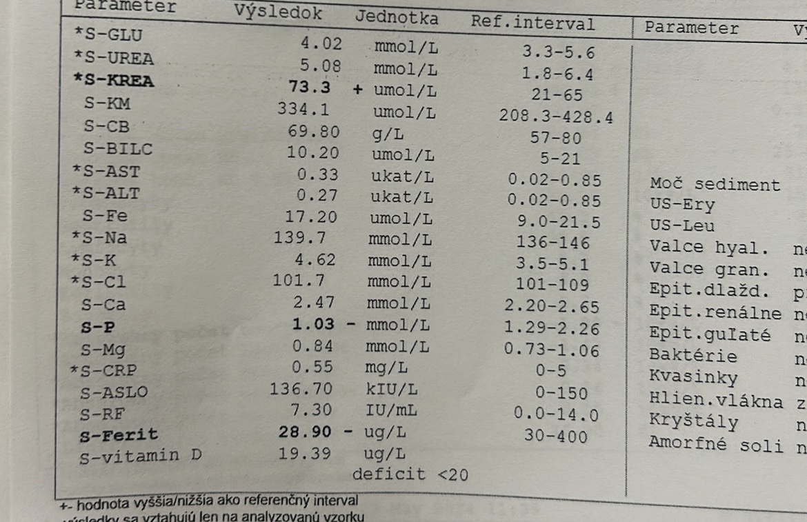 @taynee usg sme mali min rok,brucho,to bolo ok,gastro intolerancie tiez ok,pediater povedal,ze kreatinin ma zvyseny ako sportovec,plava 8x v tyzdni,ine priznaky moc nema,niekedy je unaveny,co ale pripisujeme treningom,kamoska ma strasila s leukemiou,tak som docela v strese a do vysetrenia skoro mesiac