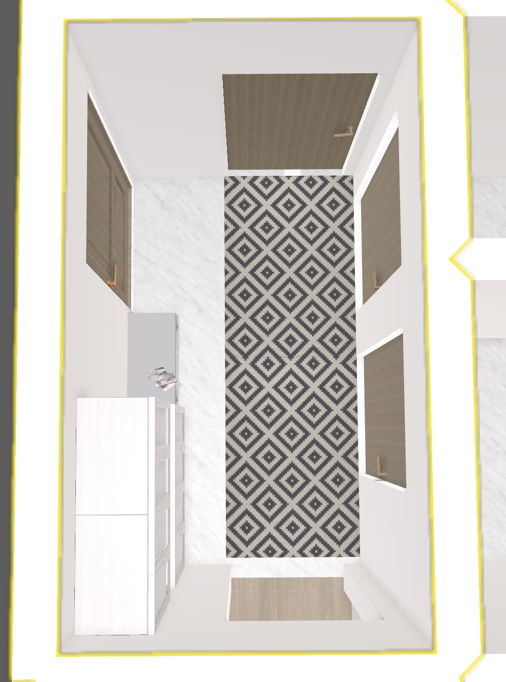 Je tam biela lesklá podlaha, všetko na nej vidno (a na ponožkách tiež). Rozmýšľame nad behúňom, no ten zasahuje do otvárania vchodových dverí a pochybujem, že by sa zmestil pod ne.