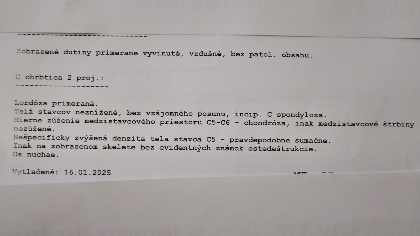 na medzistavcovej platničke medzi piatym a šiestym krčným stavcom vidieť degeneratívne zmeny medzistavcovej platničky (chondróza) a v dôsledku toho začínajúca spondylóza, čiže to postihuje aj stavce