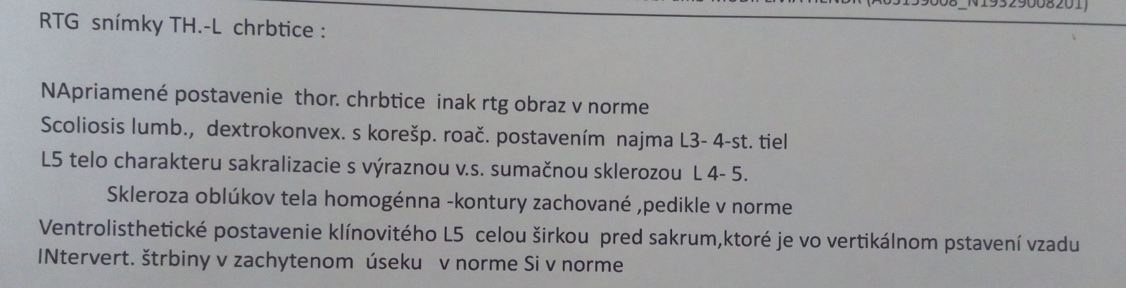 nie som odbornik len mam problemy s chrbicou a precitala som si viacere svoje spravy... z tohto si myslim, ze by mohlo ist o skoliozu t.j. krivu chrbticu z coho mas bolestsi mozno niekde zabal a klinovite postavenie posledneho stavcu L5 t.j. ma iny tvar ako by mal mat asi je splosteny? opotrebovany? ale inak je vsetko v norme, ale na rtg su vidiet iba stavce nie platnicky !!! ak chces vediet v akom stave mas platnicky a miechu treba ist na mri (ct) tam to bude vidiet nie tu. v kazdom pripade rehabilitacia ti ma pomoct od bolesti ulavit treba ju vybrat a hlavne cvicit pravidelne kazdy den inak ti nebude lepsie drzim palceky