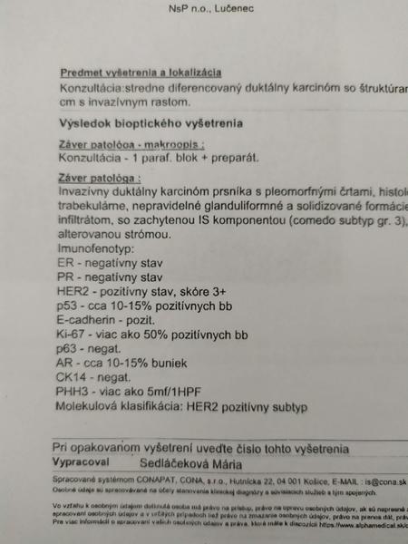 @17zuzka6 toto je krásny prípad histológie tieto všetky parametre by tam mali byt moja histologia dodrb... jak svina polovica chýbala musela som sa dožadovať dopĺňania a dodnes o uzlinach neviem koľko ich vlastne bolo poz kedze sa nezhodli. Takze asi tak.