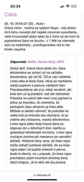 Pokial je ta farba tmavsia nez zbytok pokozky, mohla by to teoretick byt linea nigra, ale na to by bolo este celkom dost skoro.. ak je skor bledsia nez zbytol pokozky, tak to je ciara, ktoru ma kazda zena, len si ju nie vzdy vsima/vsimne. Drzim palce, nech sa zadarilo 🙂