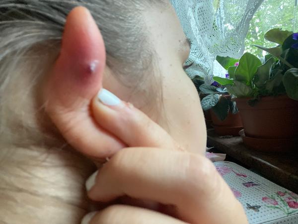 @adelkaaaaaaa máš tam naušnicu ešte? toto sa dosť často deje, obávam sa že si ju budeš musieť dať von, ale pred tým skoč ku kožnej snaď ti dá niečo na to. Keď si ju vytiahneš už ju tam nestrčíš. ucho je celkovo citlive, pozri si aj akupunktúrne body ucha, možno ste trafili niečo....