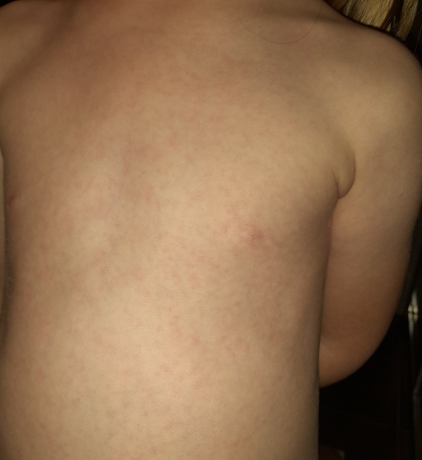 Ahojte, dcéra má od včera na hrudníku takéto červené fľaky. Nesťažuje sa na nič, nemá žiadne iné príznaky. Nestretli ste sa s niečím podobným? Ďakujem