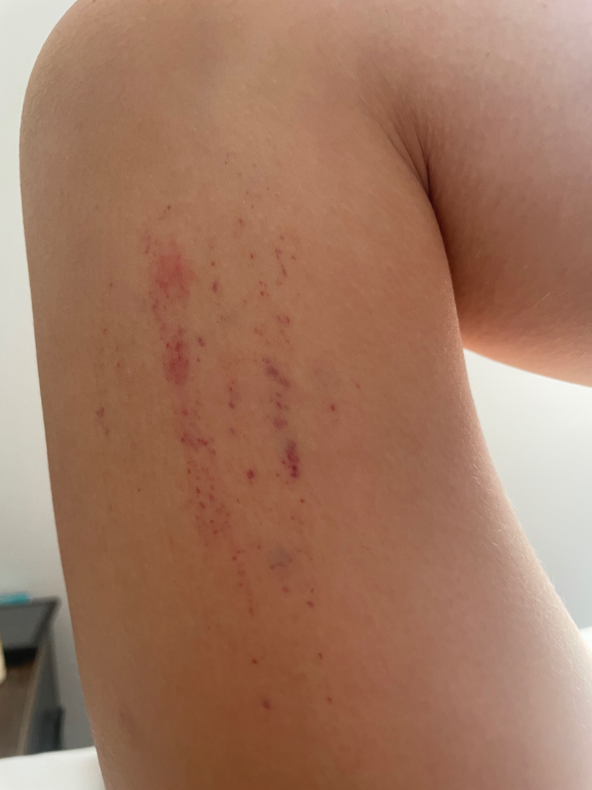 Vyzera to ako petechcie nasledkom poskrabania , to ti zmyzne.Mynule akurat davala niekto podobnu fotku ale to podla mna nebolo spôsobene poškriabaním, u teba krasne vydno pásiky od nechtov