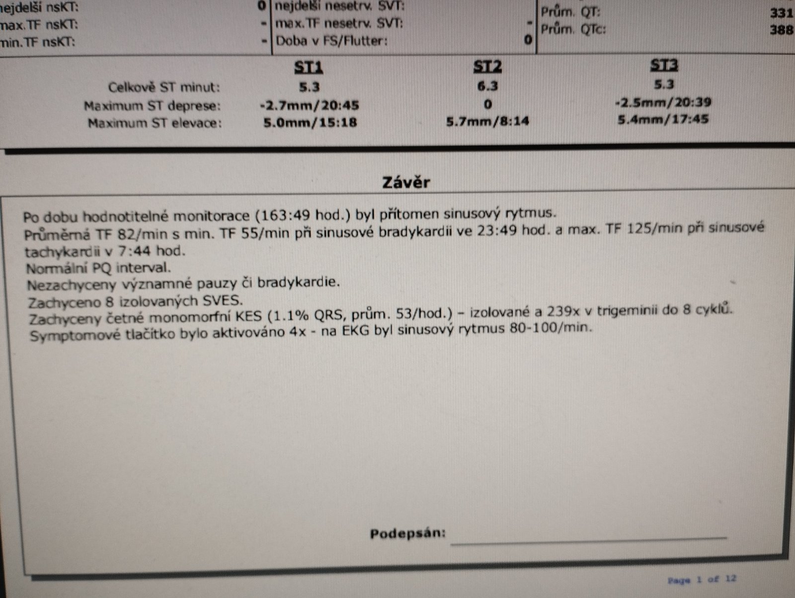 Podľa toho, čo vidím na obrázku, ide o výsledky z holterovského monitorovania EKG. Prepíšem ti hlavné závery a pokúsim sa ich vysvetliť jednoducho: