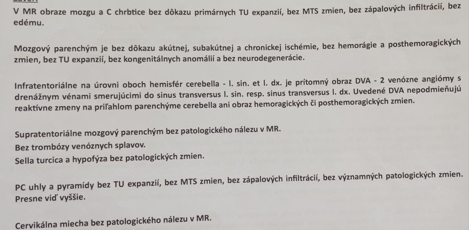 Na mozočku v oboch hemisférach (napravo aj naľavo) sú 2 angiomy (väčšinou nezhubna anomália žíl) nespôsobuje zmeny na mozočku. Ostatné časti mozgu sú v poriadku, bez zápalu, metastáz, nádorov, opuchu.