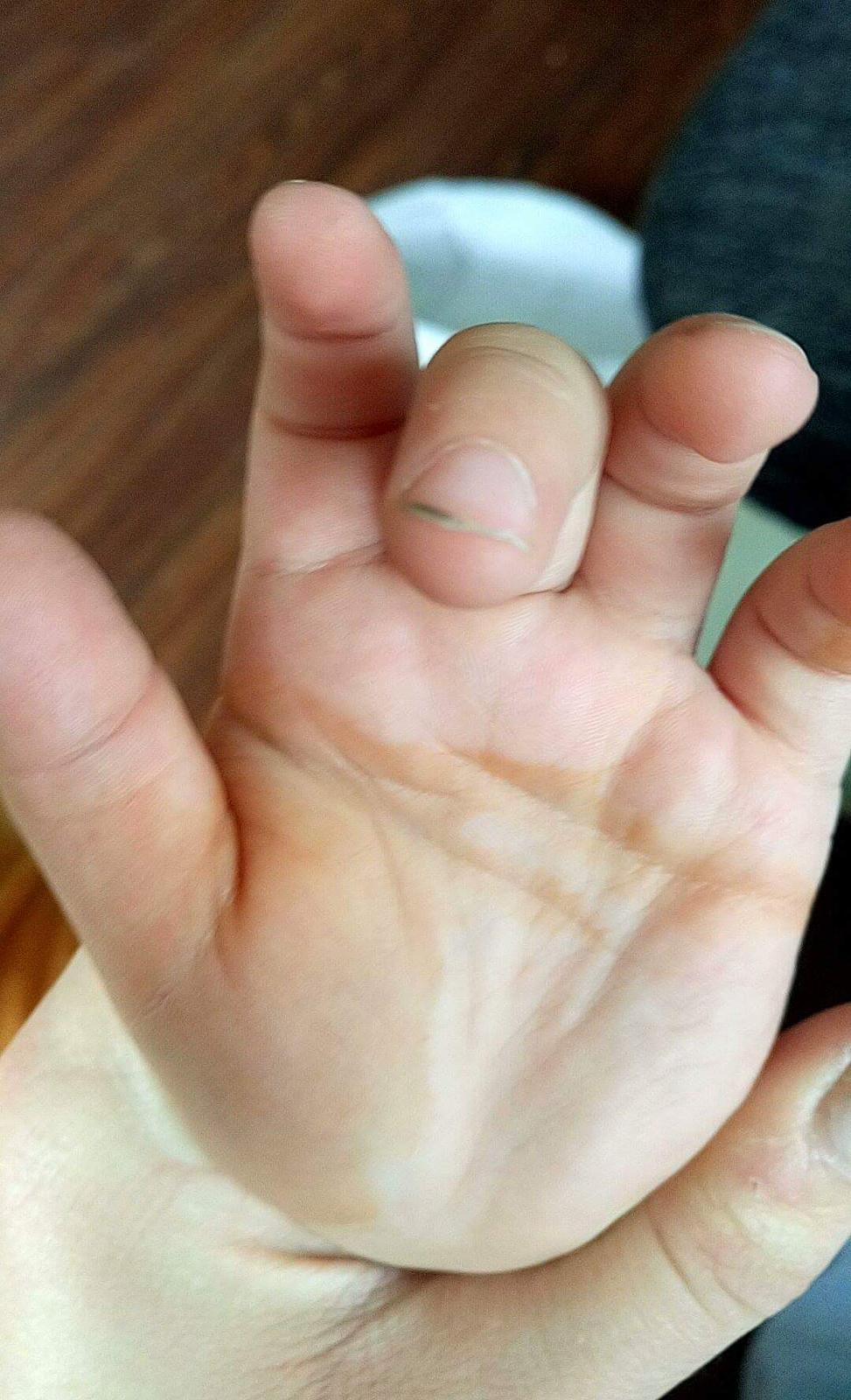 Vobec nic take nemala v ruke v noci urcite nie a rano spala do 9 ja som to uvidela okolo pol 11 a dovtedy sa hrala s hrackami ktorw drzia v ruke aj jej surodenci a nic take medzi tym nieje..co by mohlo zafarbit kožu... Neviem no