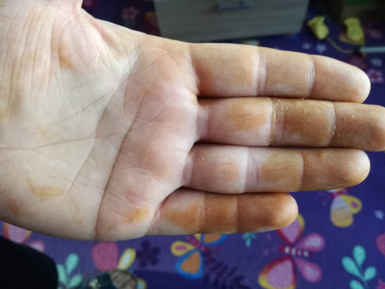 @anabella235 dobrí deň poprosím vás o info bol syn stim niekde lebo mne sa to ťieš urobilo na obe dlane ale na ľavej je to oveľa veksie ako na pravej hnedo oranžové fleky no co mu povedali