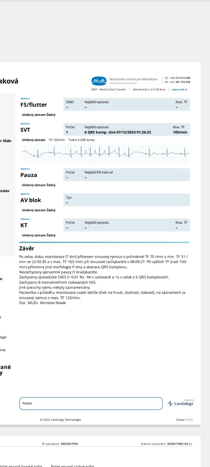 Počas celého 7-dňového monitorovania srdcového rytmu bol prítomný pravidelný sínusový rytmus (čo znamená normálny rytmus riadený srdcovým uzlom) s priemernou frekvenciou 70 úderov za minútu.