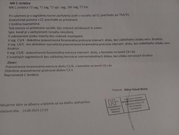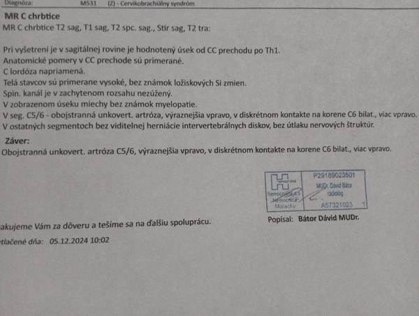 mas len miernu utlak na miechu pri C5/6 ci je to na operaciu zvazi neurochirurg. za mna treba cvicit cvicit cvicit. pisu zeje tam aj artroza. dcera mala horsi nalez poctivo cvicila sm system a pilate a cca po 1-2 rokoch sa jej stav upravil je bez bolesti. ja som cvicila zarovno s nou ale aj tak ma museli operovat no ja som mala prasknutu platnicku a tlacila na miechu cez 20mm u teba nic nepisu. ak nezabera ziadna konzervativna liecba a si len na liekoch od bolesti (ak teda poctivo cvicis) odporucam vyskusat neurochirurga co povie na nalez ale bude chciet nove mri max par mesiacov stare