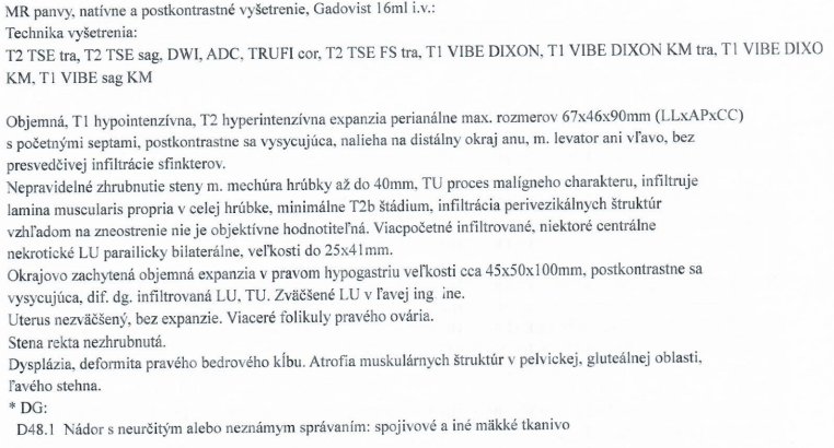 je tam popisany zhubny nador mocoveho mechura so zasiahnutim lymfatickych uzlin..treba cim skor absolvovat operaciu, zahajit liecbu a pozitivne mysliet 🙏