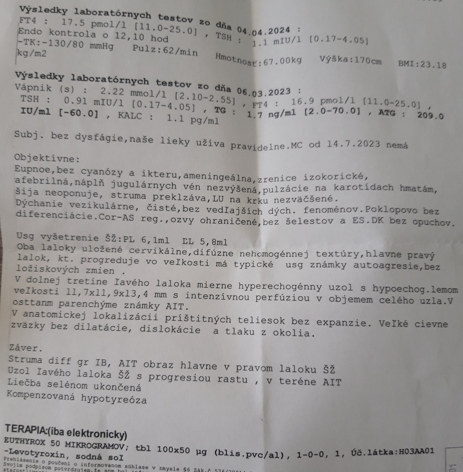 Hodnoty TSH a ft4 máš v norme, škoda že nemáš aj ft3. Užíváš lieky (umelé hormóny) a pomáhajú ti, s nimi nie si v hypo stave (v nedostatočnej funkcii ŠŽ). Struna neznamená vždy problém (väčšinou súvisí s hypo stavom: narastie objem lalokov ŠŽ, aby sa zachytilo viacej jódu na tvorbu hormónov t3 a t4, ktorých máš z nejakého dôvodu málo. Selén je pre tento proces veľmi potrebný). V diagnostike máš uvedenú difúznu strunu, tj rovnomerné zväčšenie oboch lalokov (mne struna po roku zmizla). A protilátky tiež nie sú dôvod na odstránenie ŠŽ, ja ich mám omnoho vyššie. Protilátky a-Tg, a-TPO sa vytvárajú, keď ti imunita napadla ŠŽ. V tvojom prípade sa tento autoimunitný zápal ŠŽ volá Hashimoto. Podľa správy už šarapatu urobil a vidieť ju. Nebudem ti dávať falošnú nádej, ale Hashimoto sa dá dať do remisie. Ak sa to podarí, tvoj zvyšný objem ŠŽ by to ešte mohol potiahnuť aj s pomocou liekov. U dospelého chlapa je objem ŠŽ okolo 18 ml, takže na jeden lalok vychádza 9 ml. Tvoje majú 6,1 a 5,8 ml. Chcem dodať, že na Slovensku sa Hashimota ani nesnažia spomaliť. Tu to je ortieľ. Zmena stravy ale mnohokrát pomôže.