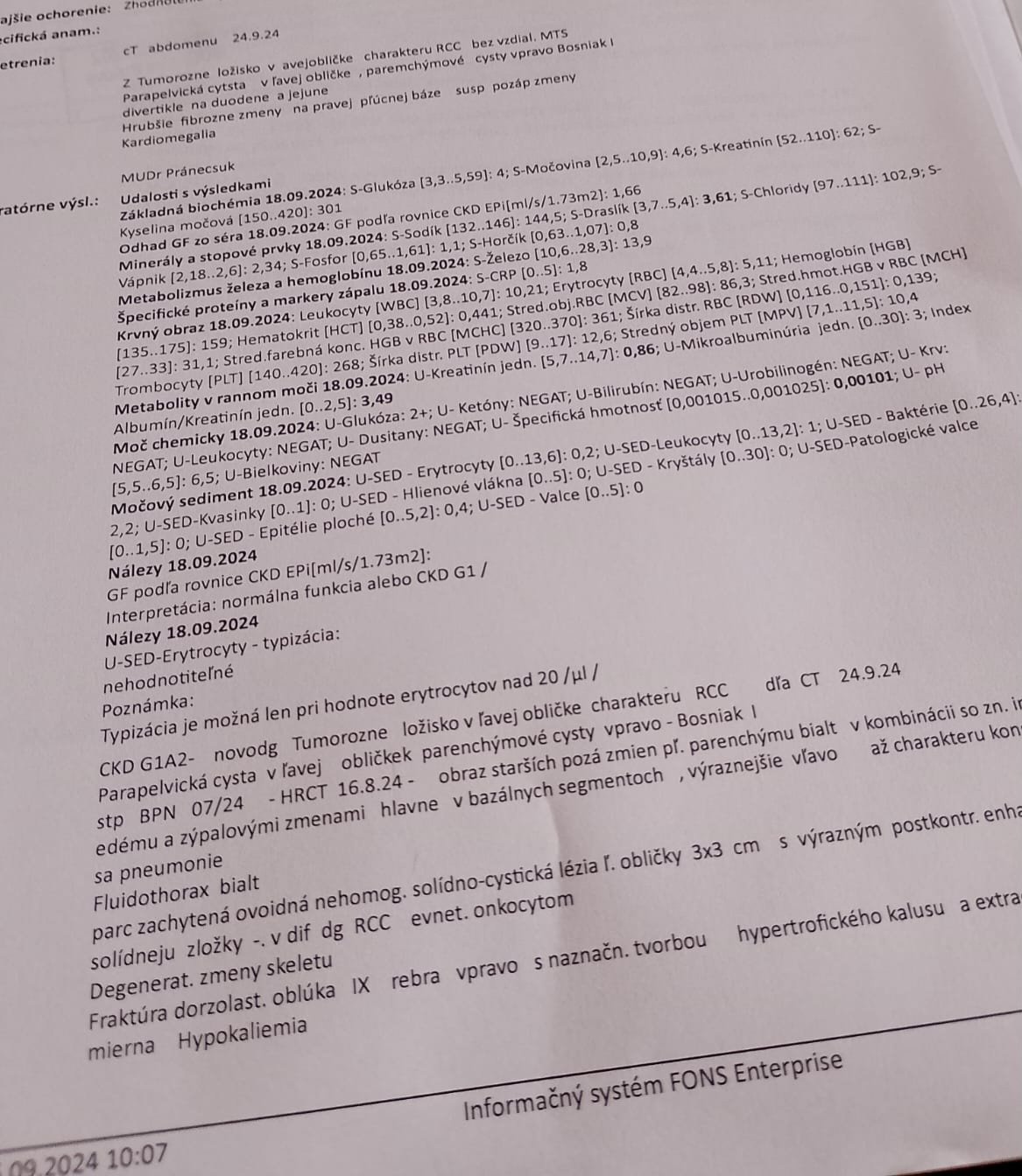Nalez na CT: CKD G1 A2, G1 znamena najlahsie stadium chronickej choroby obliciek. A2 znamena, ze ma v moci bielkovinu z krvnej plazmy, ktora by tam normalne nemala byt, a je to stredne zvysena hodnota. TIeto zvysene hodnoty zrejme suvisia s tym karcinomom. Neviem.