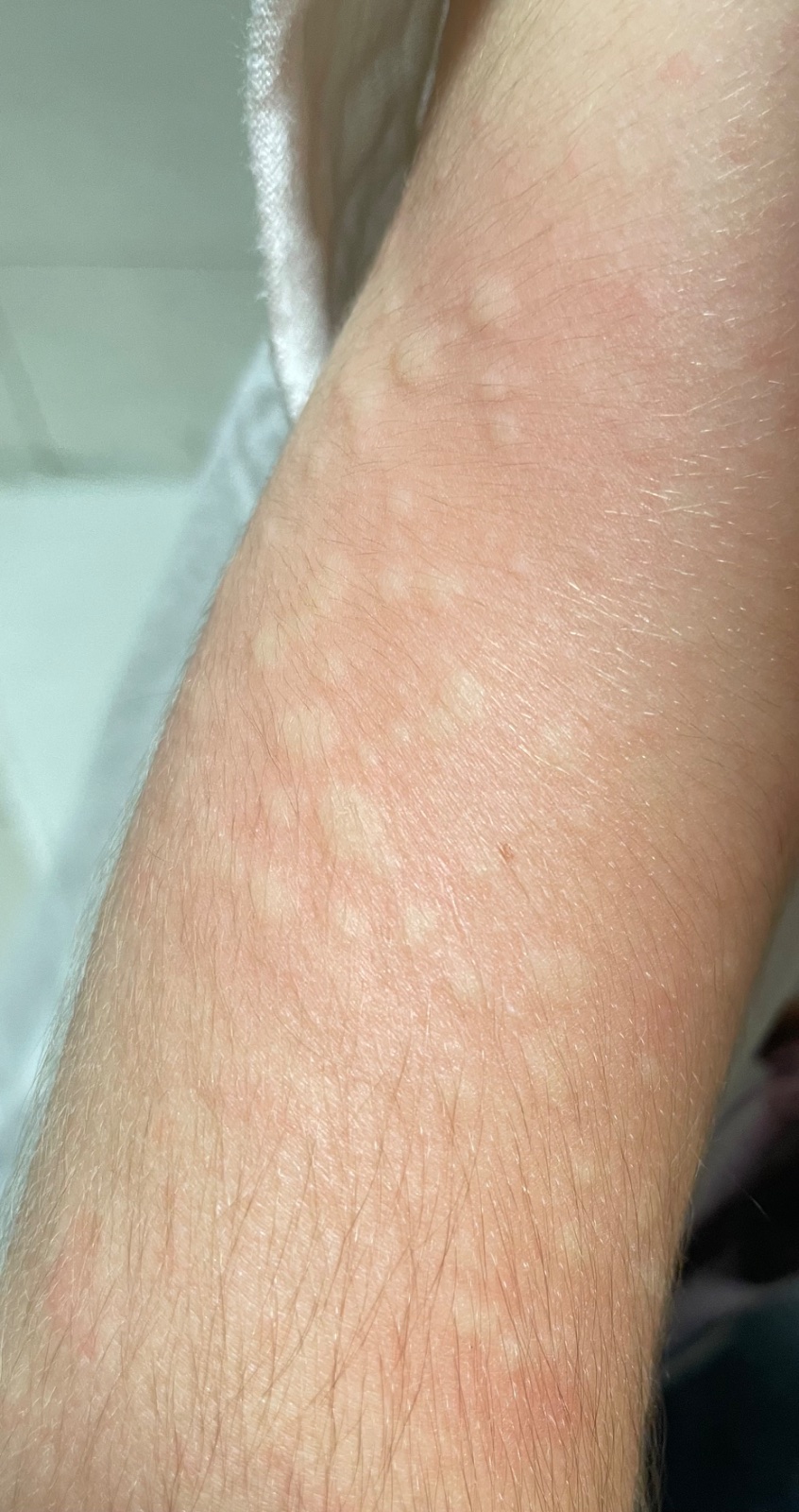 Do pár minút to prešlo, zostali iba tie malé červené vyrážky. Na rukách jej to skoro cele zmizlo, ale rano si poškrabala stehno, a znovu to iste.