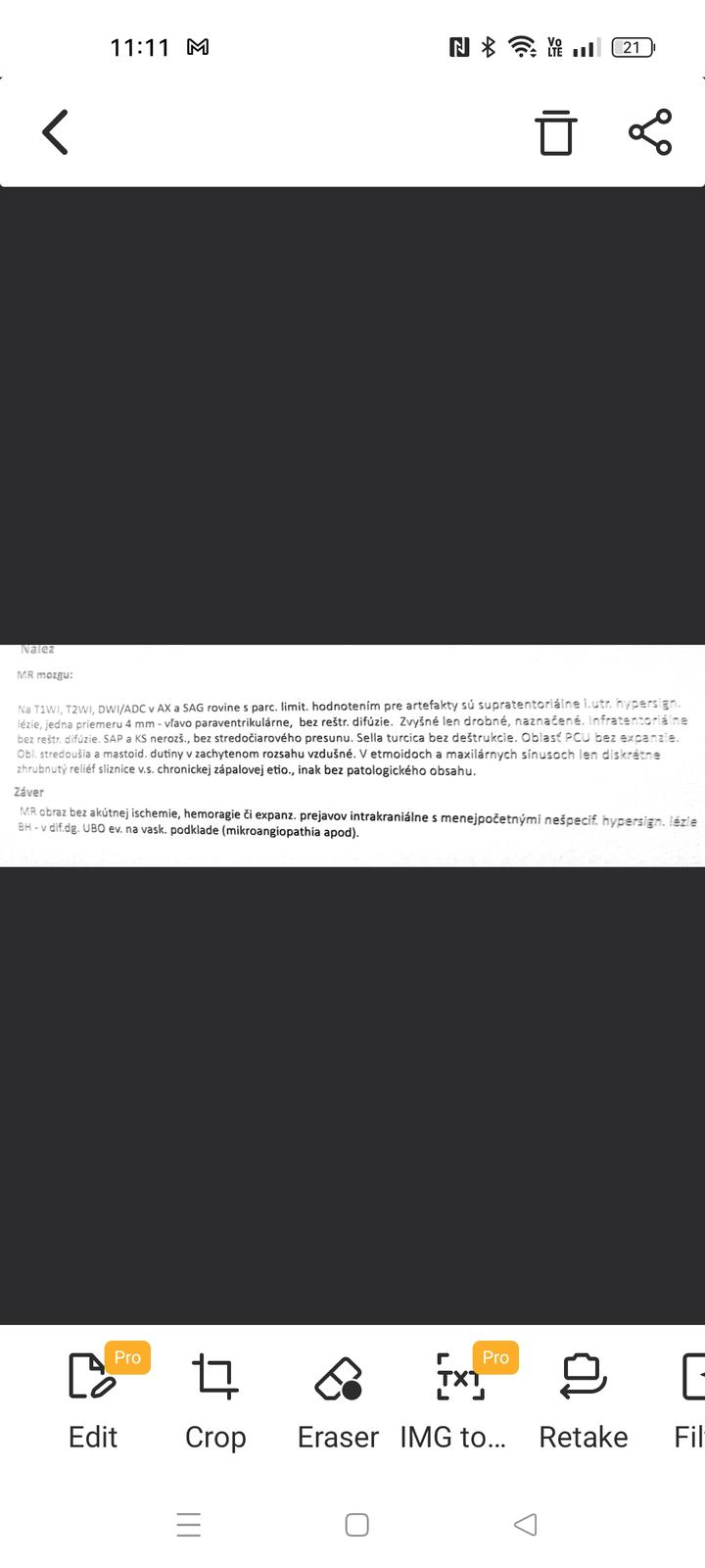 MR obraz bez akútnej ischémie, hemoragie či expanzívnych procesov : Na MRI nie sú akútne mozgovej príhody (ischémie), krvácanie (hemoragie) alebo tumorov (expanzívnych procesov).