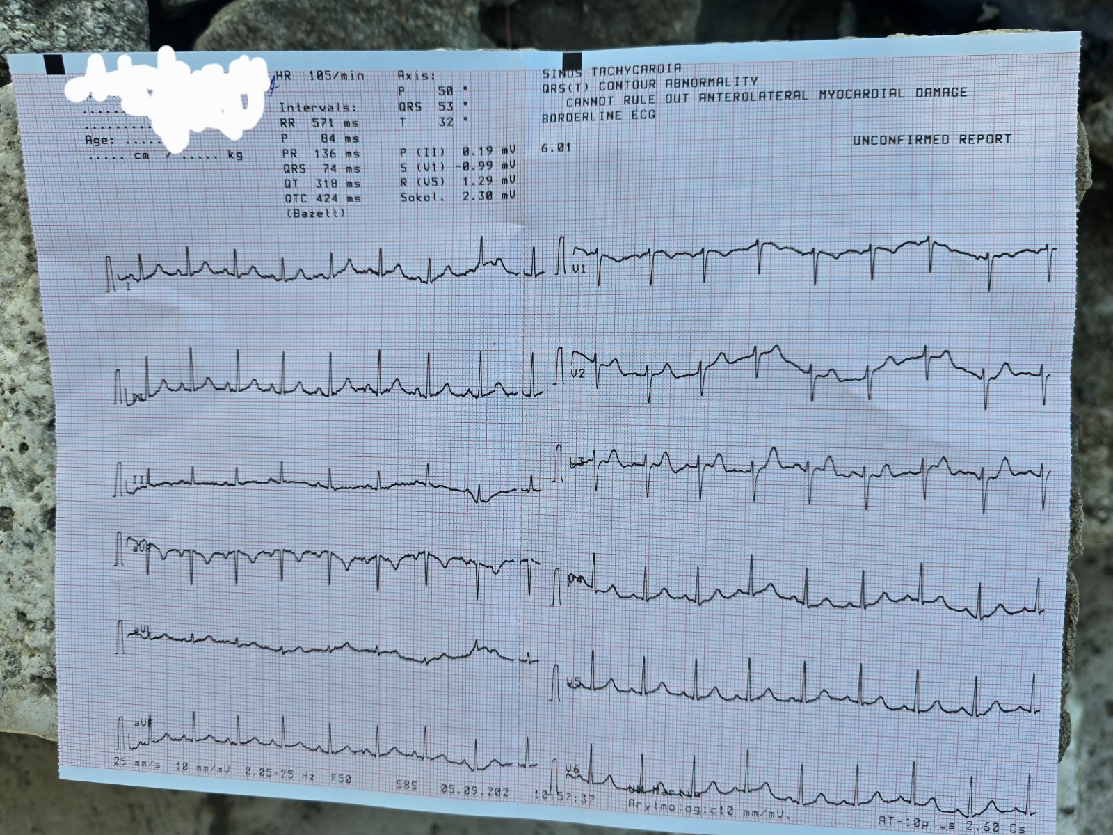 EKG ukazuje zrýchlenú činnosť srdca a zmeny v ST úsekoch, ktoré môžu, ale nemusia znamenať akútny problém (napr. ischémiu, poškodenie srdcového svalu). Určite to treba klinicky doriešiť – ak máš bolesti na hrudi, dýchavičnosť alebo iné ťažkosti, patrí to ihneď na pohotovosť / kardiológiu.
