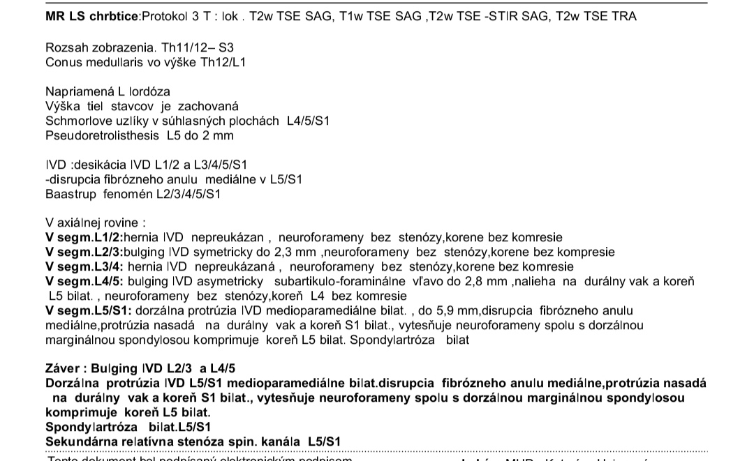 Najhorší nález je medzi posledným driekovým (L5) stavcom a hornou plochou krížovej kosti (S1). Nie je vylúčená potreba operačného riešenia. Menej závažný je nález o 1 a o 3 platničky vyššie.
