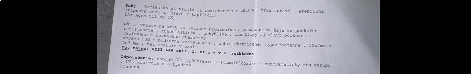 Prsvdepodobne reaktivne uzliny - uzliny zvacsene kvoli nejakej pricine (infekcii). Odosielaju ta na dalsie vysetrenia, aby sa ta pricina nasla. Moze to byt aj obyc viroza, nebola si chora? Pripadne alergia, bolavy zub, zapal…