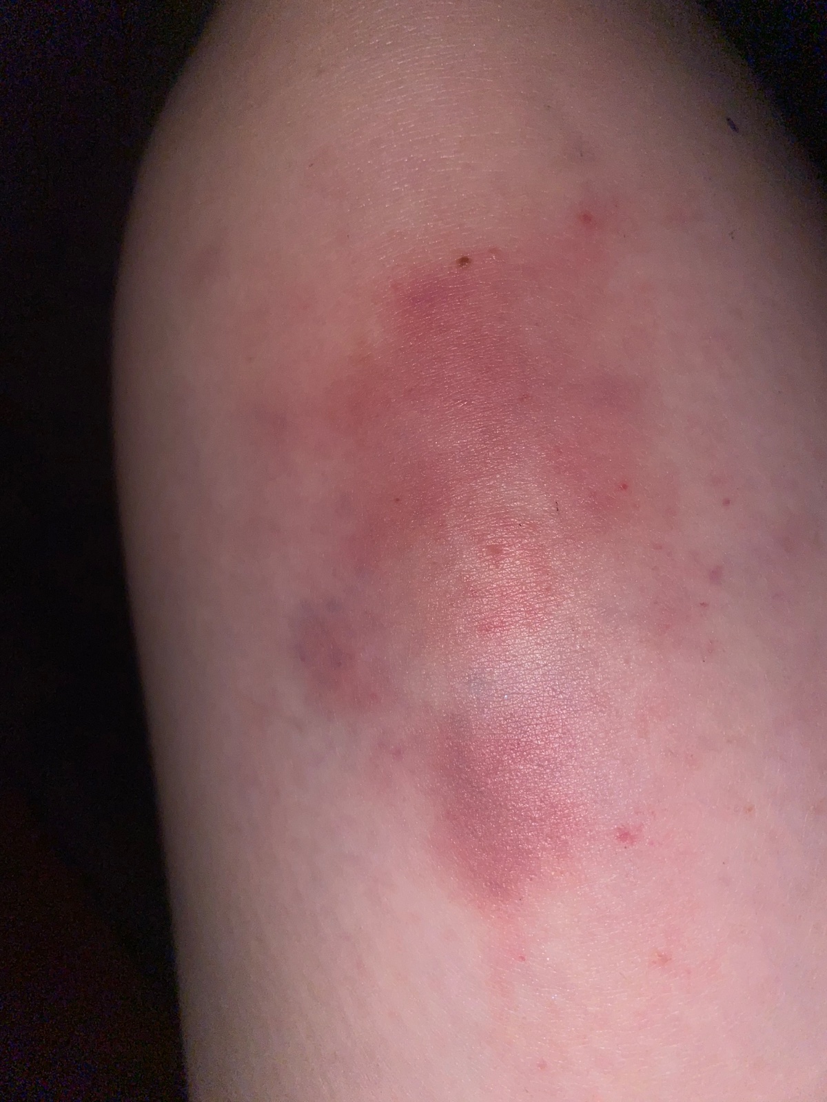 Mam to tak uz dlhsie, ked ma nejaky hmyz stipne, neskutocne ma to svrbi, boli a stipe a nasledne je z toho modrina. Aj ked je to obycajny maly komar. Dnes ma zas nieco stiplo, na zaciatku to vyzeralo ako obycajny komar, no strasne ma to boli a je z toho toto. Prikladam fotku. Isli by ste na pohotovost? Čo to je?