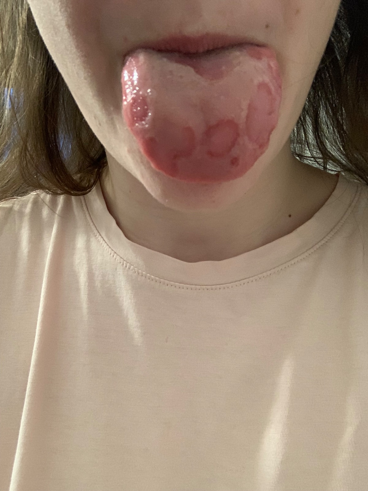 Dcera to ma od narodenia, je na to aj nejaky odborny nazov, pracovne to doma volame geograficky jazyk, lebo sa jej tam tvoria rozne obrazce a mapy, je uplne zdrava, imunolaergologicka aj krcny zhodnotili, ze jednoducho niekto ma takyto jazyk, je to v poriadku, obcas ma na jazyku aj srdiecko, niekedy nic, inokedy dva fliaciky, kazde dva tri dni nieco ine