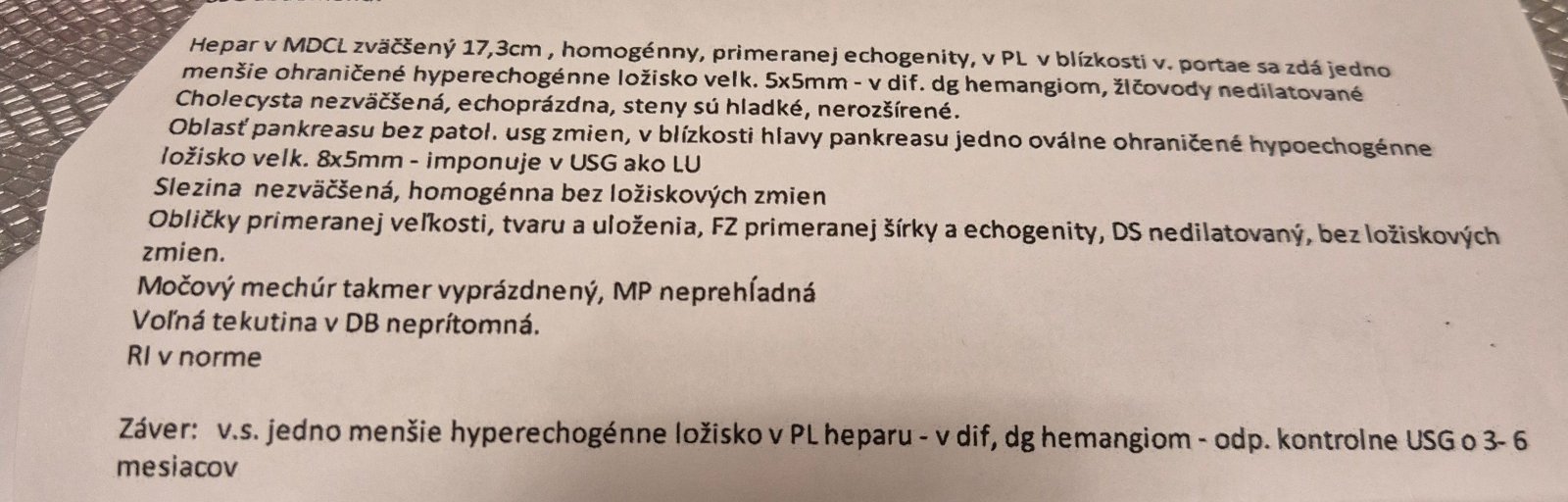 V pečeni (pravdepodobne hemangióm) – bežný, zvyčajne neškodný útvar.