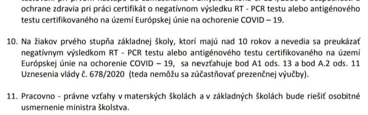 @tosomja cit.: – deti, ktoré dosiahli vek 10 rokov, ale stále chodia do štvrtej triedy prvého ročníka, môžu absolvovať cestu z a do školy. ............................ čiže musí mať test, aby mohla fungovať ako ostatní s negatívnym testom.