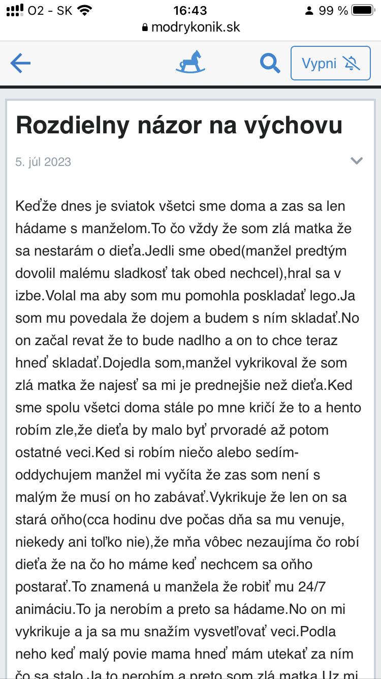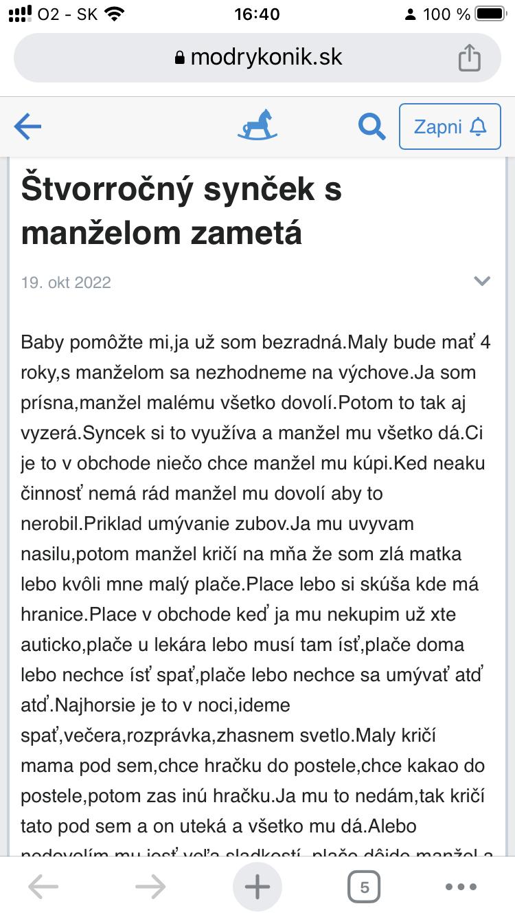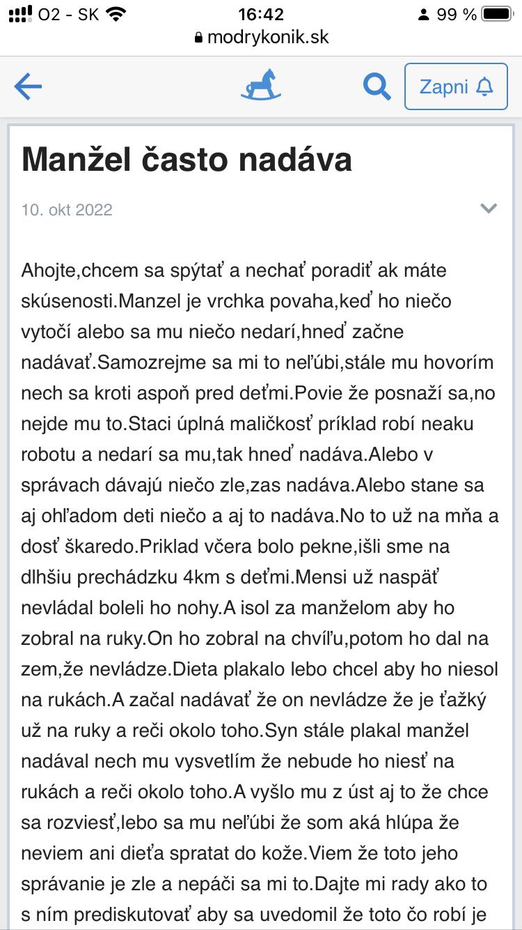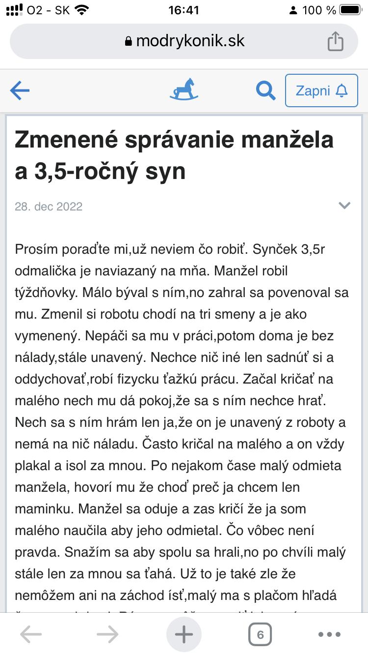 @miriam11 Ale zivot s takym toxickym clovekom, ako je jej muz, je na mile vzdialeny od normalnosti. Ta zena ma k tomu cloveku zavisly vztah, nesprava sa ako bezny partner. Nema ziadne hranice, sebahodnotu a sebavedomie - to sa odraza na vsetkych jej vztahoch - napriklad k detom a suvisiacich problemoch. Ale odist evidentne nechce, len sa tu pride vyzalovat a potom napise inu temu. Nema odvahu vziat svoj zivot do svojich ruk, nema odvahu spravit ani male kroky v jej zivote. Je to jej rozhodnutie. Je mi to luto, odide v buducnosti, ked to toxicke spravanie sa prenesie aj na syna a uz to nebude unosne.