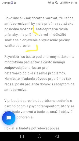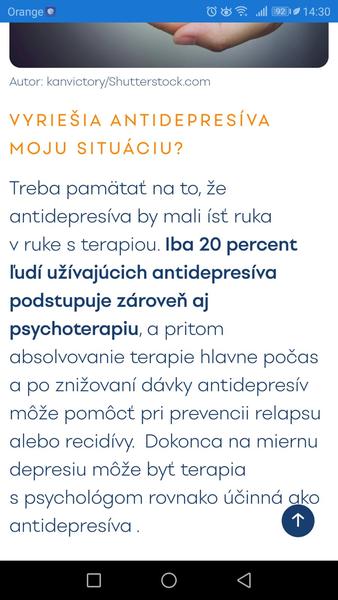 @irusa Tak to si nepochopila. Samozrejme že to nie sú vitamíny ani výživový doplnok a majú aj vedľajšie účinky. Ale v kombinácii s dobrou psychoterapiou sú liečivé na daný problém a negatívnych vedľajších účinkov nemajú toľko, ako boli AD v minulosti. To aj k liekom na srdce je kopec nežiadúcich účinkov a kardiaci ich musia brať, inak dostanú infarkt. A u mňa som ich pobral len 15 mesiacov a nepotrebujem ich. Ja som nikde netvrdil, že riešia príčinu depresie. Ak je príčinou úmrtie blízkeho človeka, alebo rozchod, alebo trauma ako to bolo u mňa, tak to nevyriešia. Ak je príčinou zlé myslenie, to tiež nevyriešia. Ale liečia. Nie len potláčajú. To je napísané aj v príbalových letákoch, u môjho lieku tam bolo písané aj že sa predpisujú preventívne. Samozrejme nie u zdravých ľudí, ale u tých, kde by mohlo dôjsť k opakovaniu depresívnych stavov. A áno, sú aj psychoterapeuti, ktorí ti povedia, že sa im lepšie robí s ľuďmi ktorí neberú AD, lebo sú viac ochotní spolupracovať. No sami vedia, že to niekedy nejde. Proste sa to nedá vydržať a ak nechceš aby niekto spáchal samovraždu, alebo skončil so zničenou psychikou natrvalo, tak AD sú jediné riešenie.