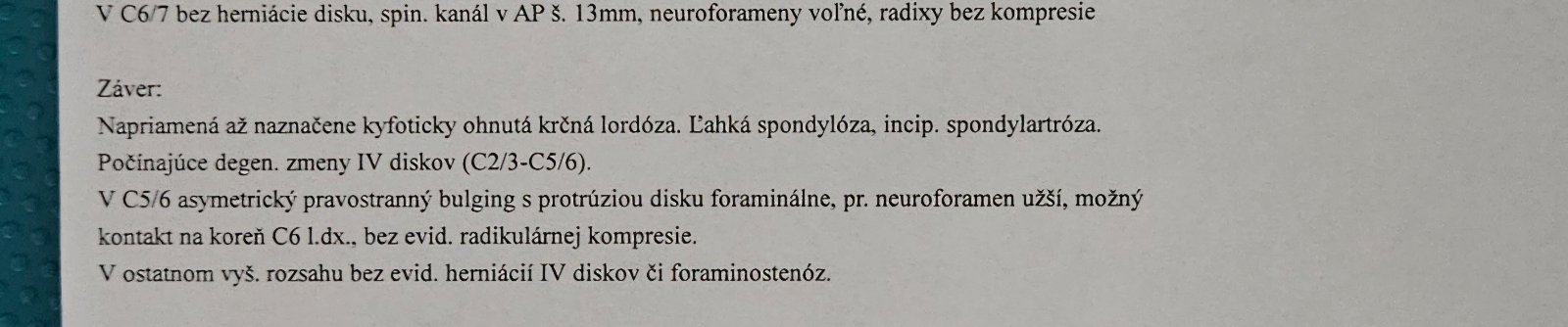 V ostatných oblastiach krčnej chrbtice nie sú prítomné žiadne herniácie (vykĺznutie platničky) alebo zúženie otvorov pre nervy (foraminostenóza).