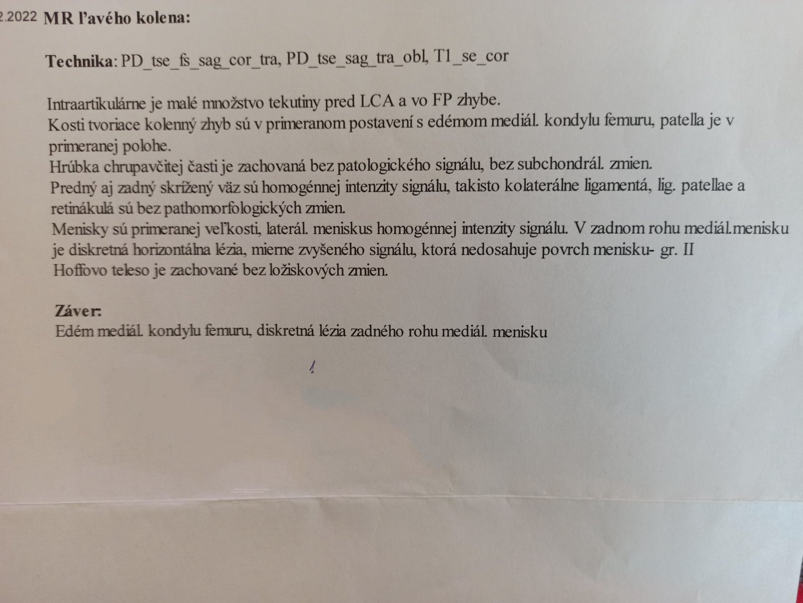 Ahojte. Pripajam aj svoj vysledok z mri. Máte skúsenosť? Operácia ani nič mi nebolo odporučené, len kolagenove injekcie. Stačí to?