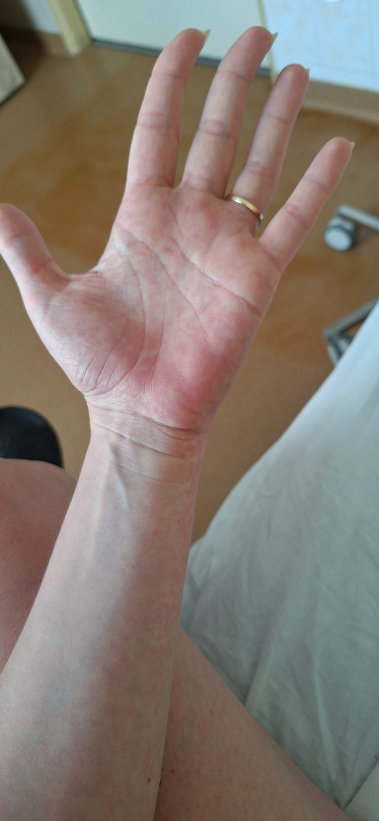 No ja momentálne ležím v nemocnici s 5.chorobou... ja som mala podozrenie na alergiu na jedlo a nakoniec z toho vysla 5.choroba . Ja som mala zrazu jednu noc strasnu zimnicu a teplotu 38,2...strašnú bolesť hlavy.. 3 dni ma estde boleli ruky a nohy a bola som ze extremne unavena.. potom dva tyzdne v pohode len ma hlava bolela stale a potom zrazu bum a cervena cela tvar ako keby spálená od slnka..aj líca aj nos.. na druhy den sa pridali ruky..cervene velke flaky, horúce na dotyk .. další deň som mala celé mramorové nohy a stále to vyzeralo horšie.pridala sa malátnosť,bolest hlavy a tie flaky na tele sa zhorsovali..bola som u koznej a ta ma poslala na hospitalizaciu.. tu mi davaju 3den kortykoidy... dlane aj chodidla mam opuchnute ..extremne svrbia az pália .. je to hrozne..trva to uz tyzden a nema to konca