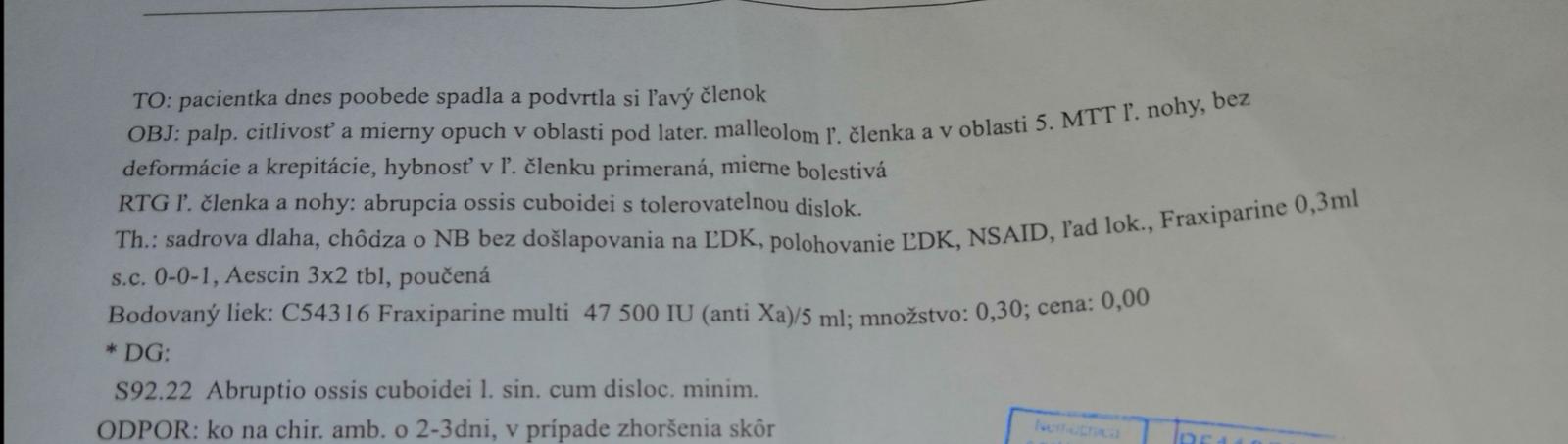 zlomena kockovita kost (v priehlavku), je to iba trosku posunute takze to zrejme netrebalo napravat(nie som zdravotnik)