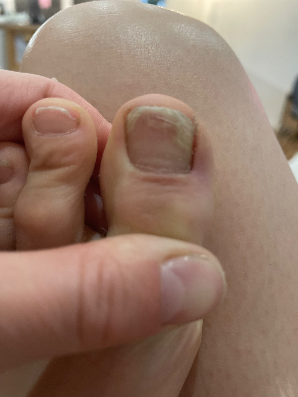 Toto nie je pleseň, ale onycholyza. Vystrihat, nasadiť onygen...zmeniť obuv...tlačí na nechtovu platničku, moze ti cely nechet odpadnut. Topánka musí byť širšia, dostatočný priestor na prsty. Pokiaľ to nebudeš riešiť, môže sa pridruzit spomínaná pleseň...