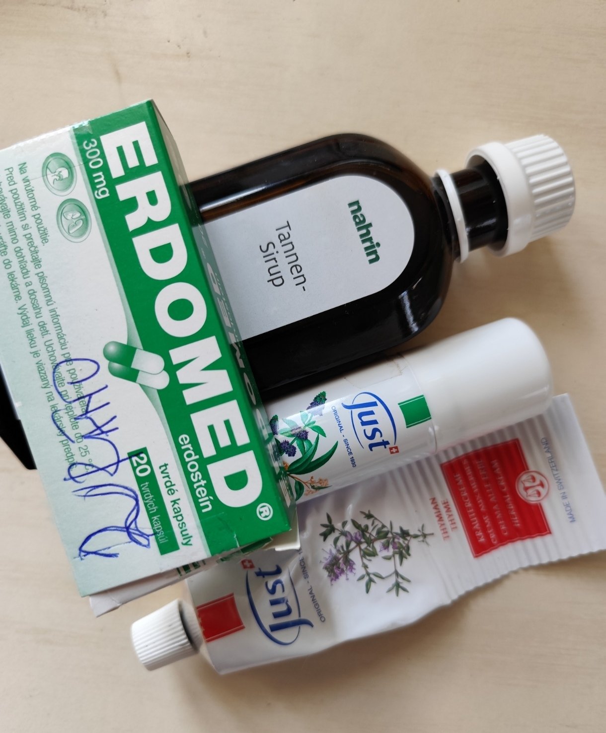 A kolko ten erdomed beries ? Lebo to to sulmi ucinne lieky a treba ich len dobrat. Sliznica je citliva a prekonala nejaky zapal. Aj po dobrati liekov mozes vykasliavat este aj 2 tyzdne, kym sa to da do poriadku. Skus si k tomu kupit aj pastilky pantenol, ktore pomahaju k hojeniu.