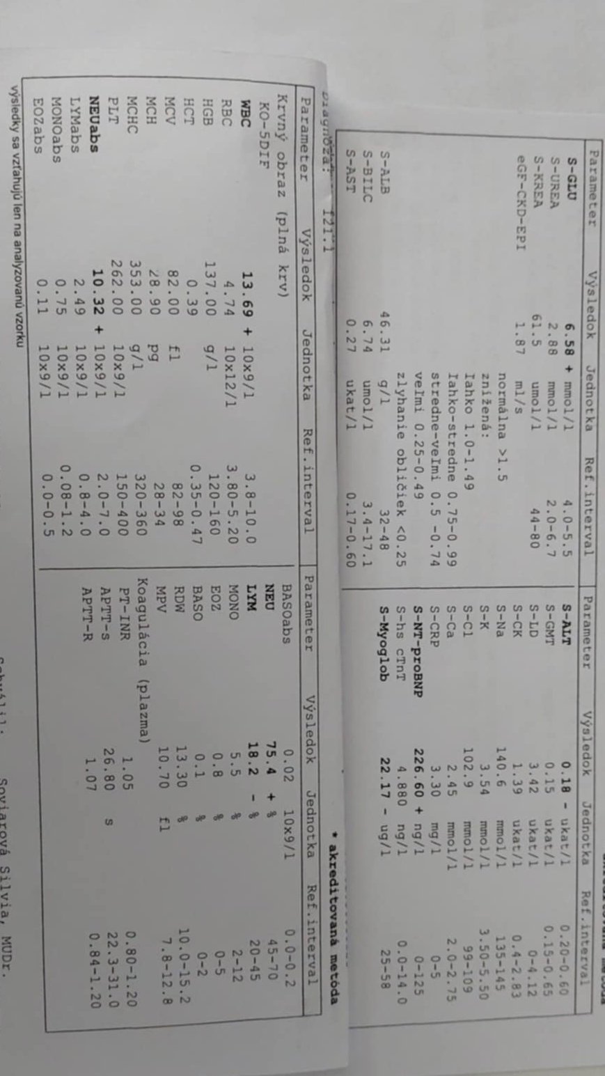 Nevieme preco si bola na pohotovosti,to je dost podstatne. Leukocyty mas zvysene len mierne,to byva pri zapale,z tohto by ma znepokojovalo len zvysene s-nt-proBNP, co je srdcovy marker a znaci nejaky srdcovy problem. Ani si nebola chora nedavno,nic ti nebolo a isla si na pohotovost? 🤔A odtial ta pislali domov s akym vysledkom?