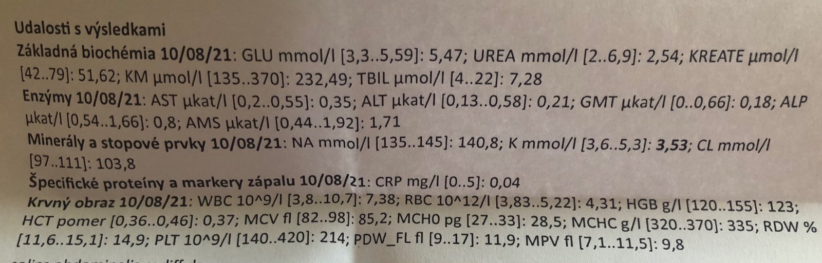 V zatvorkach je normalny rozsah, staci len porovnat s vysledkom. Zbezne som to prebehla je jemne znizeny draslik, inak vsetko v norme. Ale ze kvoli comu a na co vsetko to brali, to.si sa mala lekara opytat.