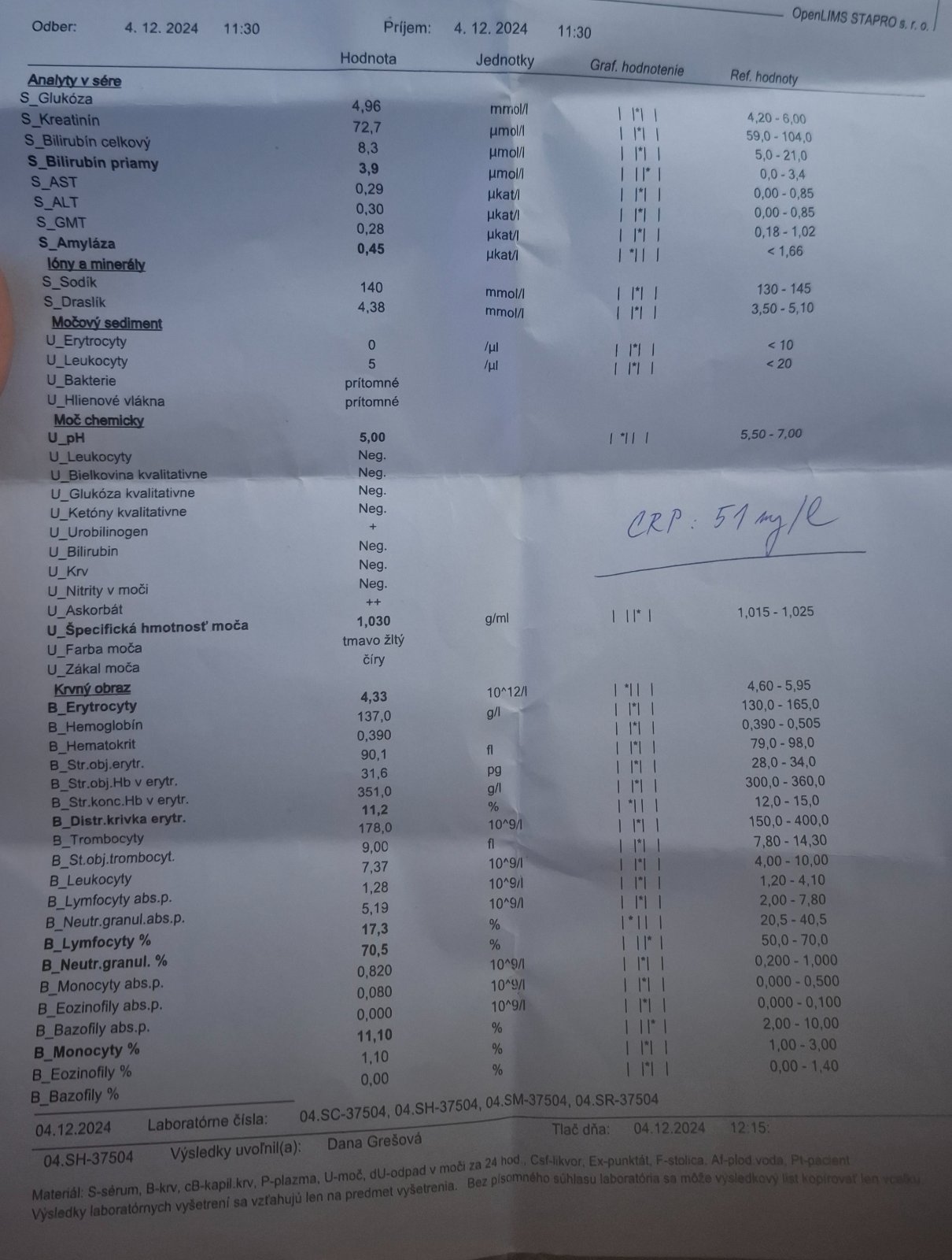@lenuska333 Pre chronickú pankreatitídu môže mať minimálne zvýšený priamy bilirubín a prítomný urobilinogén v moči, zníženú sérovú amylázu (pankreas neprodukuje dostatok tráviacich enzýmov), ostatné nefyziologické výsledky (lymfocyty, monocyty, neutrofily) nie sú významné, zvýšené % neutrofilov môže súvisieť so zvýšeným CRP, ľahko zvýšené monocyty bývajú pri/tesne po vírusovej infekcii. ZS