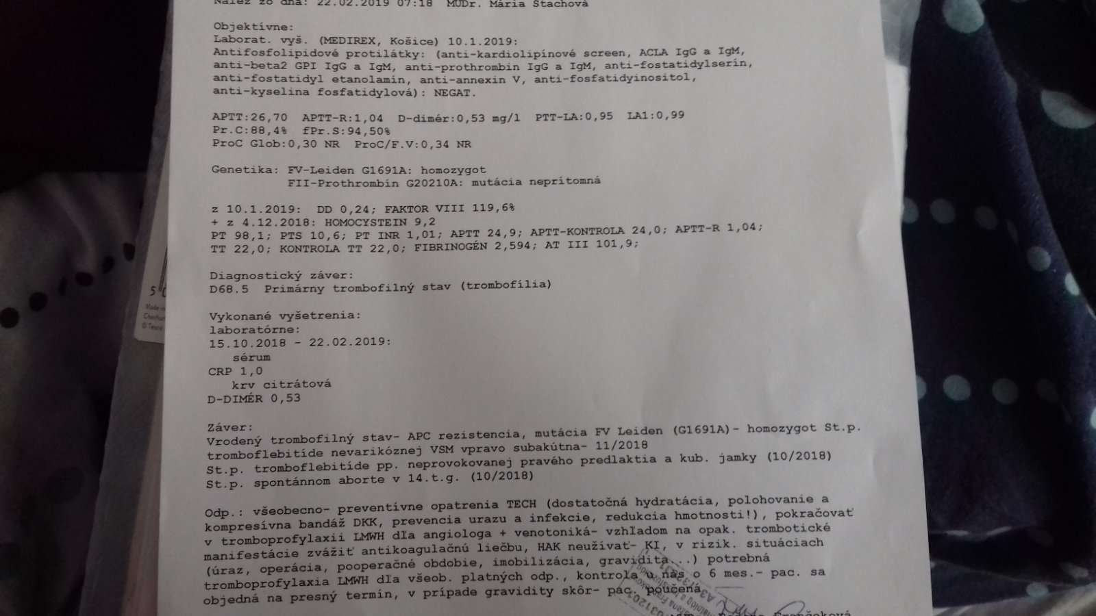 @natali408 ahoj,nedá sa mi zväčšiť obrázok,čo si priložila.Mne počas tehotenstva zistili homozygot na MTHFR C677T a heterozygot na G20210A. Bližšie sa v tom nevyznám,len som počas tehotenstva musela pravidelne chodiť na vyšetrenia krvi a od istej doby si pichať fraxiparin. Dieťatko sa narodilo bez problémov. A ja som naďalej sledovaná u hematologa (každého pol roka odber krvi), bez liečby,s upozornením,že pri ďalšom tehotenstve alebo zlomenine,či operácii mám prísť hneď na kontrolu.