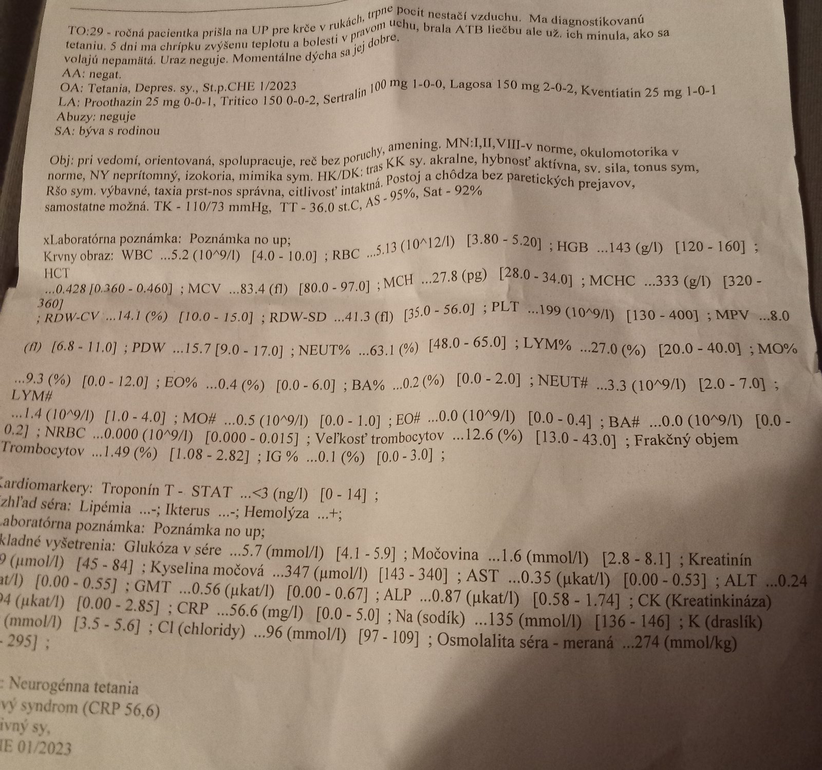 A kvôli čomu si šla na urgent? tetániu máš už asi dlhšie, spomína sa už v úvodnej anamnéze, plus máš tam lieky (predpokladám) od psychiatra. Počas viróz sa zvykne stav prechodne zhoršiť. Užívaš Mg? aké? mne pri kŕčoch pomáha doplniť B-komplex alebo MilgammuN