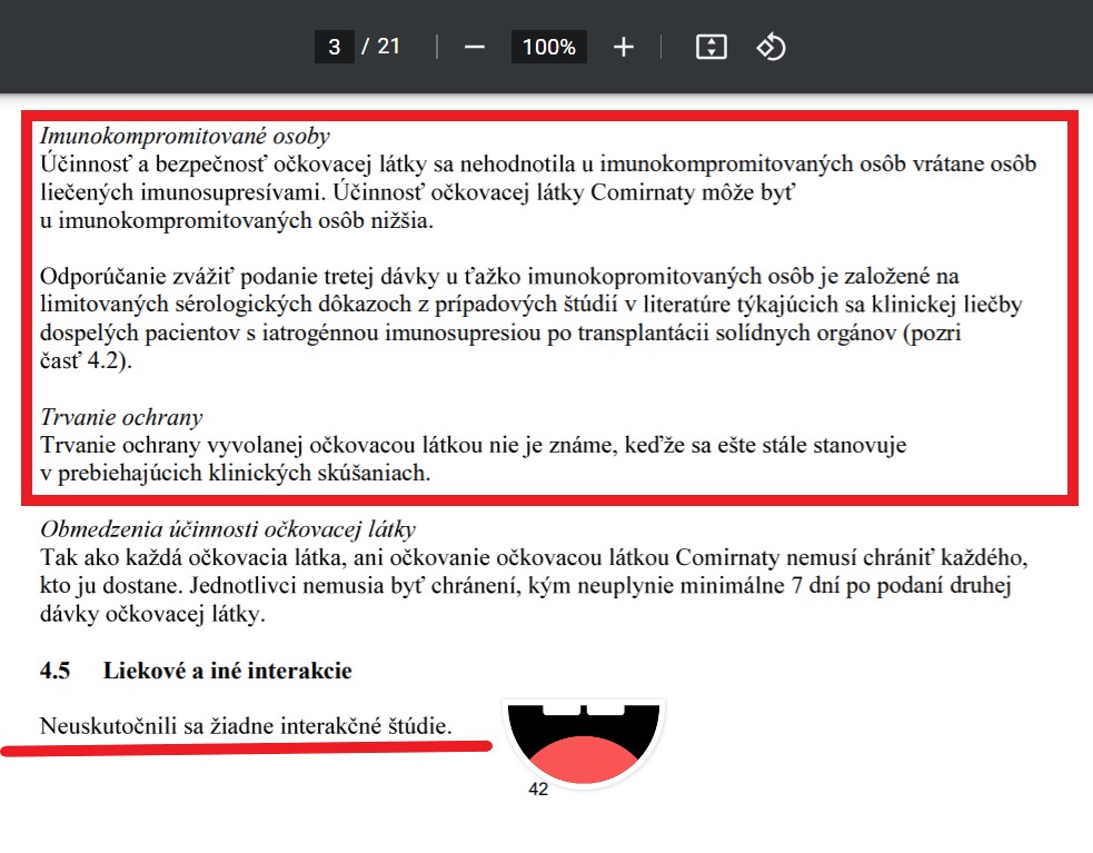 je smutné, že tu hneď zasvieti čierne na žltom, že je diskusia zavádzajúca, ale to, že pichajú do ľudí hlava-nehlava látku, ktorá okrem toho, že je experimentálna NEBOLA otestovaná na imunokompromitovaných osobách (je pacient s poklesom nešpecifických aj špecifických imunitných mechanizmov, takýto pacient je ohrozený závažnými, život ohrozujúcimi infekciami) je už v poriadku a kompetentní na to vôbec neupozorňujú... a taktiež neboli urobené žiadne štúdie voči iným liekom, ktoré človek užíva.