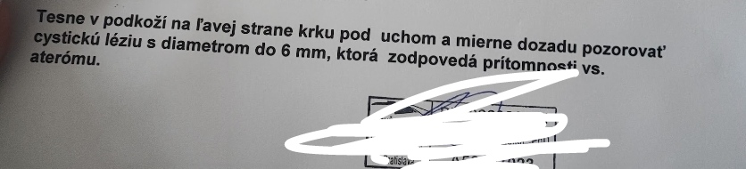 je to urcite aterom-pise sa to dokonca aj v sprave, byvaju povrchovo v podkozi a vznikaju,ked sa upcha vyvod mazovej zlazy, nic nebezpecne, odstranuju sa, ked sa zapalia alebo z kozmetickych dovodov